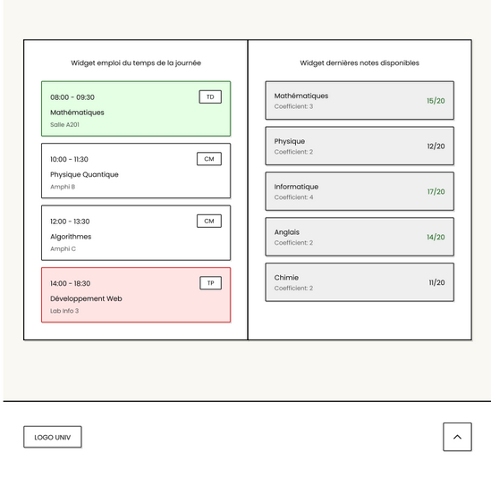 L’objectif principal était d’appliquer concrètement les principes du design system et de l’UX/UI afin de concevoir une interface adaptée aux besoins des étudiants. Ce projet m’a permis de développer mes compétences en création d’éléments graphiques, en structuration visuelle et en organisation d’une interface complexe, tout en découvrant les méthodes de travail collaboratif propres à la conception de wireframes.